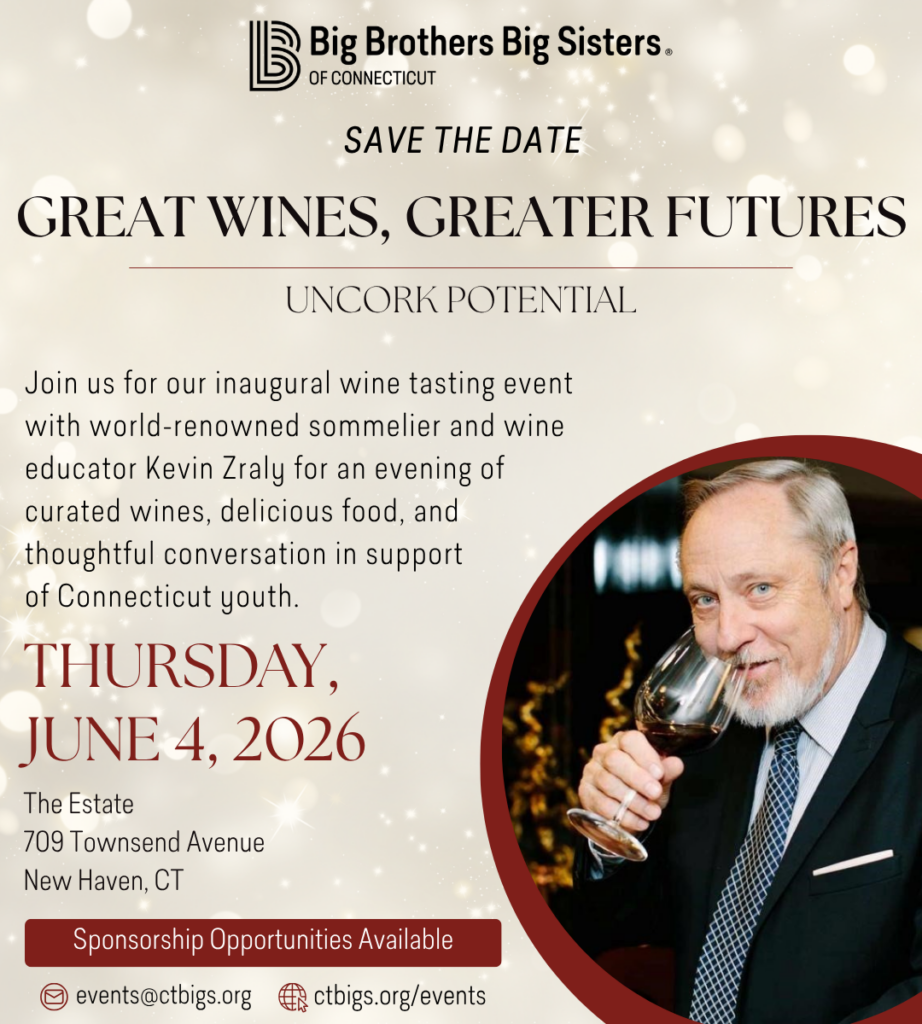Join us on June 4th for an unforgettable evening at our inaugural wine tasting event featuring world-renowned sommelier and wine educator Kevin Zraly. Enjoy a thoughtfully curated selection of exceptional wines, delicious food, and inspiring conversation, all in support of Connecticut youth. Purchase your ticket or explore sponsorship options here!